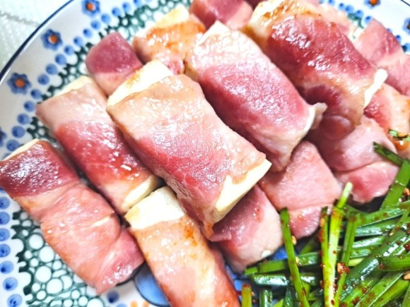 Arrange the cooked Tofu Bacon Rolls and the prepared chive salad on a serving plate. The combination of soft, mild tofu, crispy, savory bacon, and the refreshing chive salad is absolutely delightful! This dish is a great option for a light yet satisfying meal, perfect for both kids’ main courses and as an appetizer. Enjoy this healthy and flavorful treat!