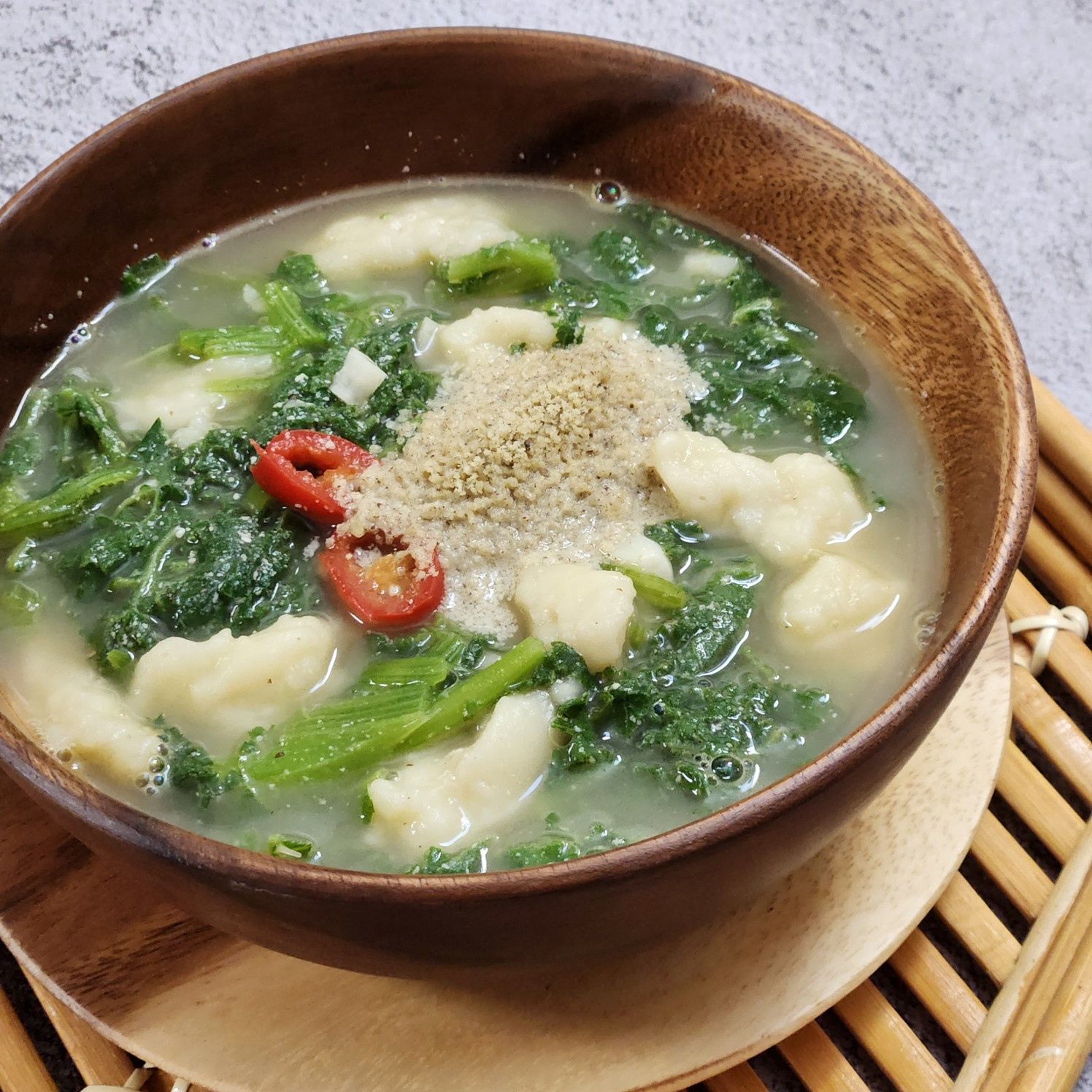 This is a savory zucchini leaf soup brimming with tender, sweet zucchini leaves harvested in season. Packed with nutty perilla powder, it’s a delightful combination of taste and nutrition. I’ve recreated a nourishing, revitalizing dish that my mother used to make often in my childhood. With the addition of chewy handmade dumplings (sujebi), it makes for a hearty and satisfying meal.