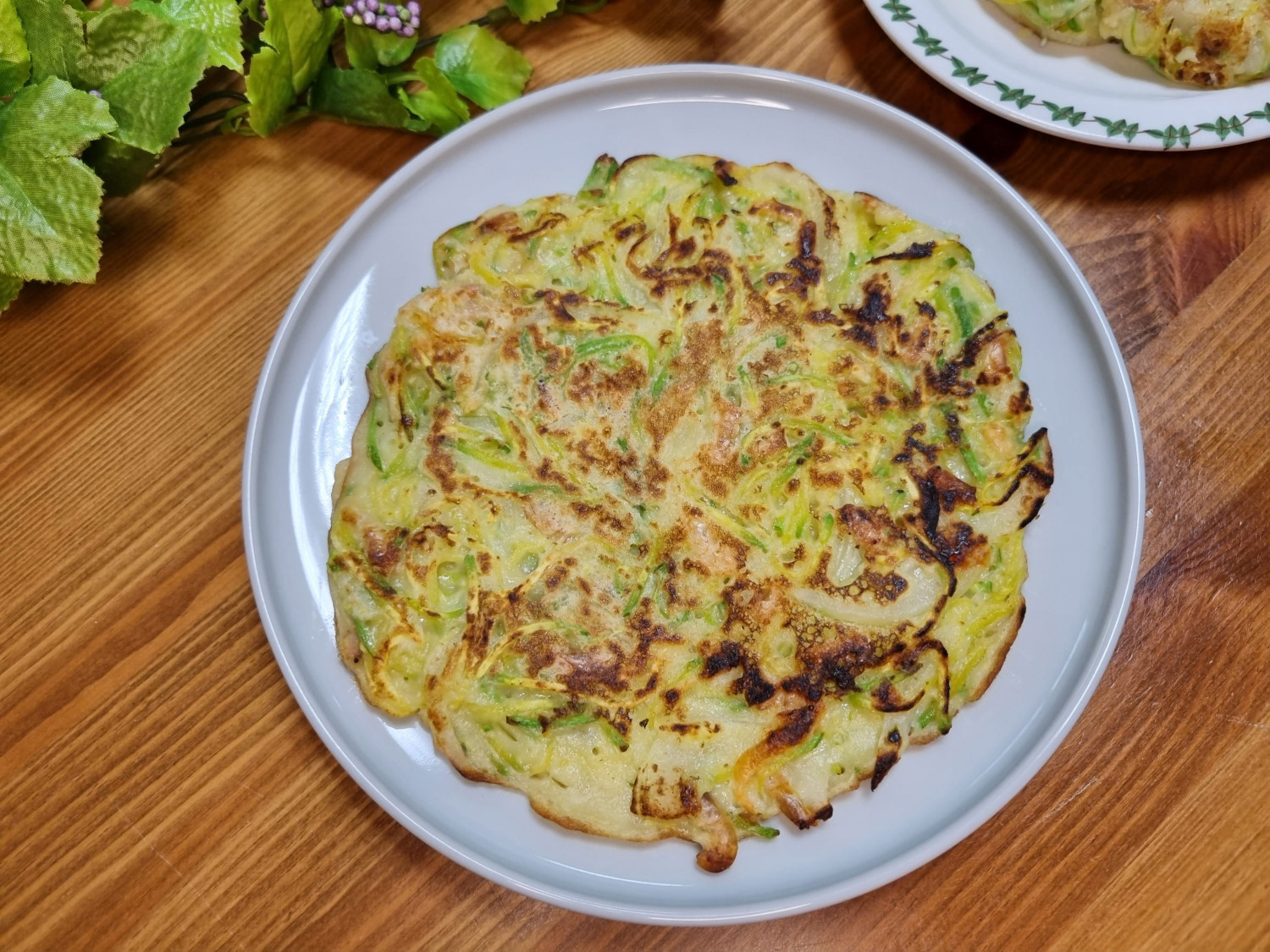 I had a zucchini and wondered what I could make with it quickly. I thought a savory pancake with dried shrimp would be delicious, so I decided to julienne it and make this pan-fried dish. ^^