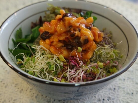 Add the Sea Pineapple: Gently place the prepared sea pineapple pieces on top of the rice and vegetables. The vibrant colors of the vegetables and the sea pineapple are coming together, signaling that your bibimbap is almost ready!