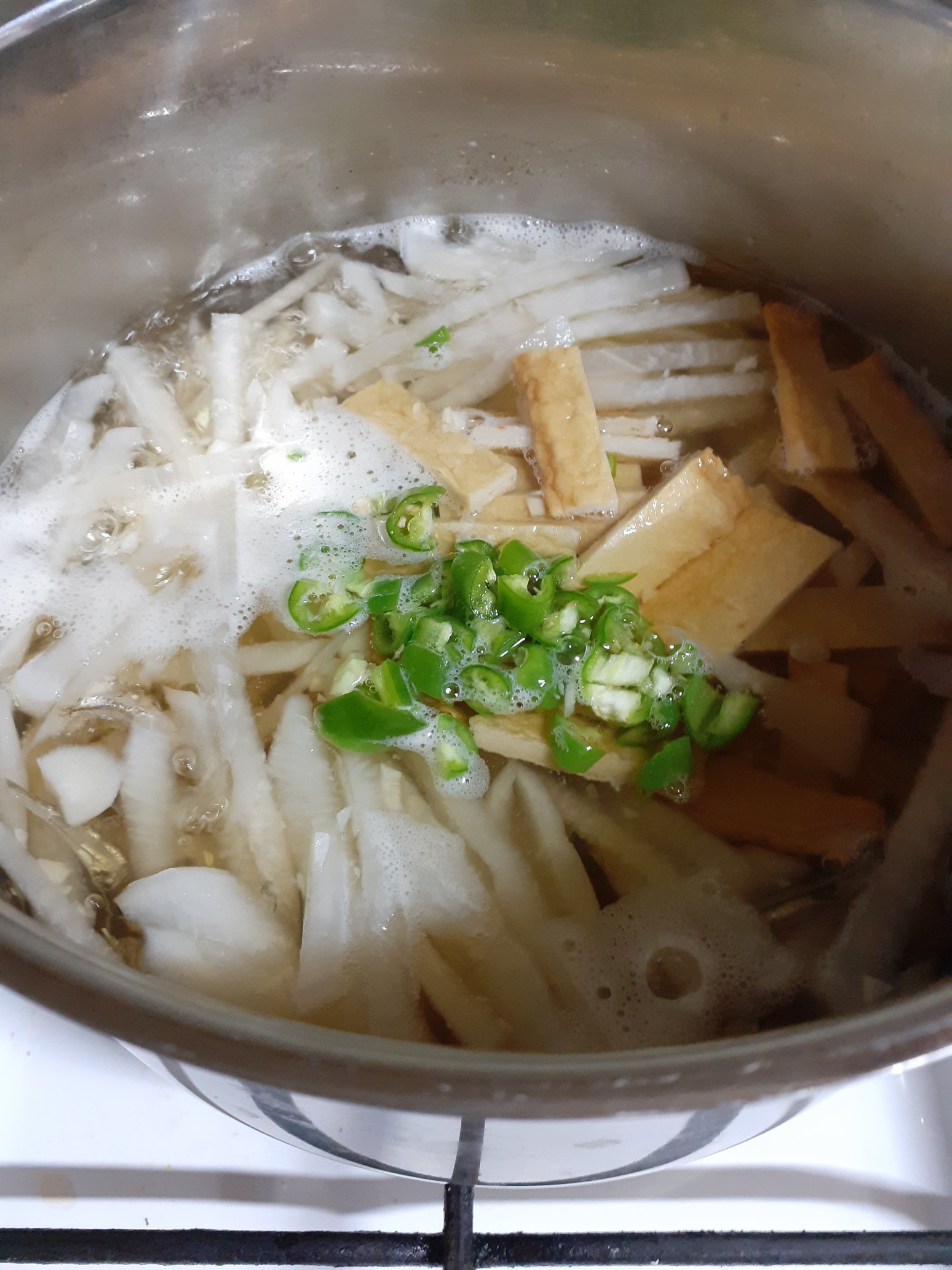 After the fish cakes have simmered for a moment, add the diagonally sliced green chili pepper for a hint of freshness. Next, stir in 1 tablespoon of soy sauce for soup and 1 tablespoon of minced garlic, ensuring the seasonings are well distributed throughout the broth.