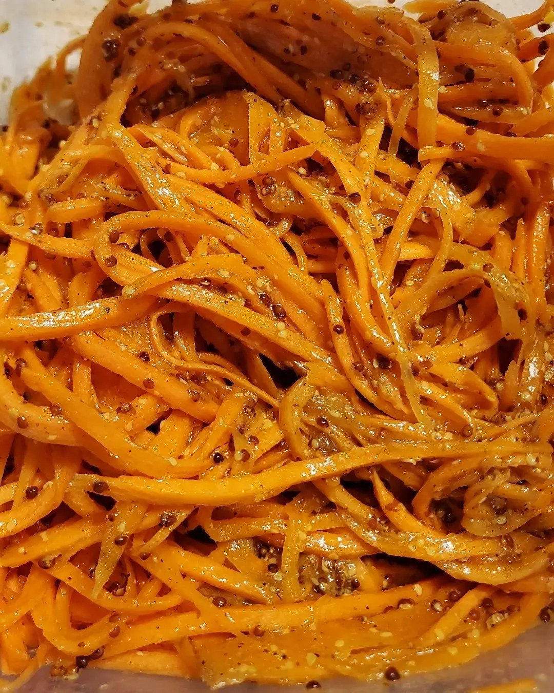 Add the 1/2 Tbsp of coarse salt (sea salt) to the julienned carrots. Gently massage the salt into the carrots with your hands for about 10 minutes to draw out some moisture, which helps maintain a crisp texture. Be careful not to over-salt or let the carrots become too soft.