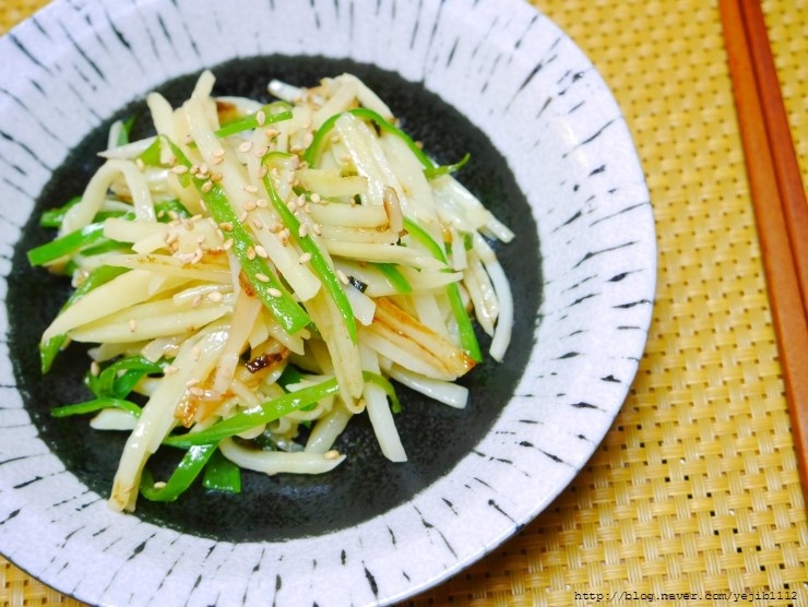 When the potatoes are almost cooked through (they should be easily pierced with a fork), add the sliced Korean green pepper. Stir-fry quickly for about 30 seconds. Peppers can become soggy if overcooked, so it’s important to maintain their crispness.
