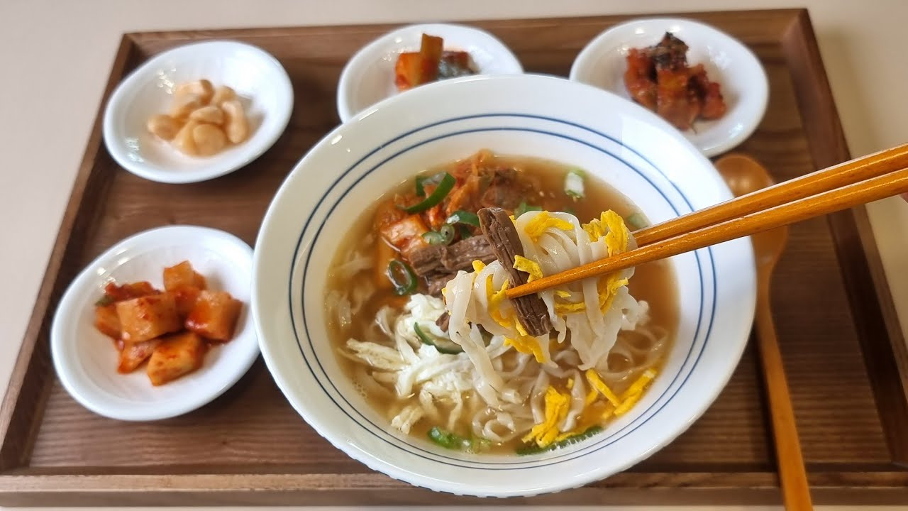At my home, we tend to eat all the solid ingredients from soup dishes and leave a lot of broth behind. As expected, after making Galbitang (Korean beef short rib soup) this time, all the meat was eaten, but the broth remained! So, I decided to make Beef Noodle Soup (Uyeokmyeon) with it. Luckily, I had homemade Kalguksu noodles and some delicious braised beef (Jangjorim) on hand. All I needed to do was cook the noodles, and it would be a fantastic noodle dish! I then added a bit of my favorite kimchi as a topping, and voilà – a custom-made Uyeokmyeon was ready in no time! I happily devoured the entire bowl by myself, as if it were disappearing before my eyes. Enjoy this delicious Kimchi Uyeokmyeon made simply with Galbitang broth!