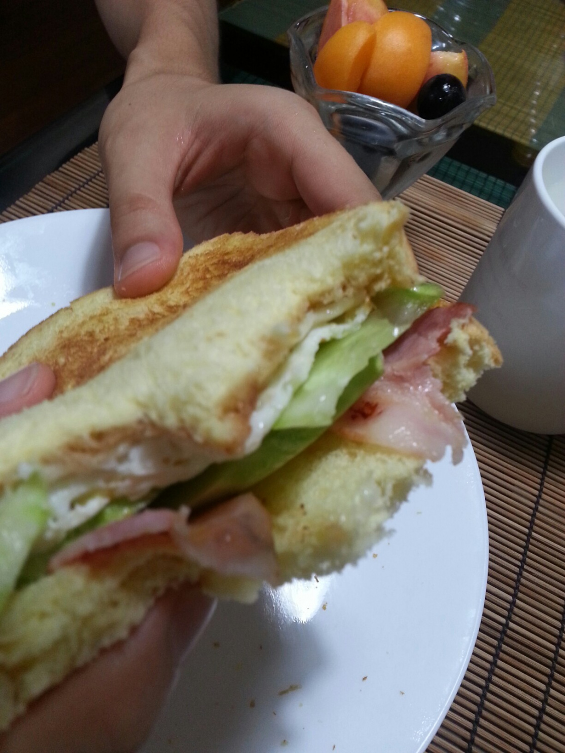Next, layer the perfectly cooked bacon and the savory cheddar cheese on top of the egg and cucumber. Finally, place the second slice of toasted bread on top to complete your delicious morning toast! Serve immediately while warm for the best flavor and texture.
