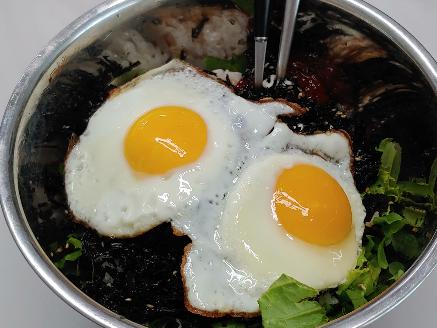 Carefully place the prepared sunny-side-up eggs on top of the bibimbap. Your delicious and vibrant Yangpun Lettuce Bibimbap is now complete! Mix everything together thoroughly with chopsticks or a spoon before enjoying. This is a fantastic dish to satisfy your appetite, especially on days when you’re craving something light yet flavorful.