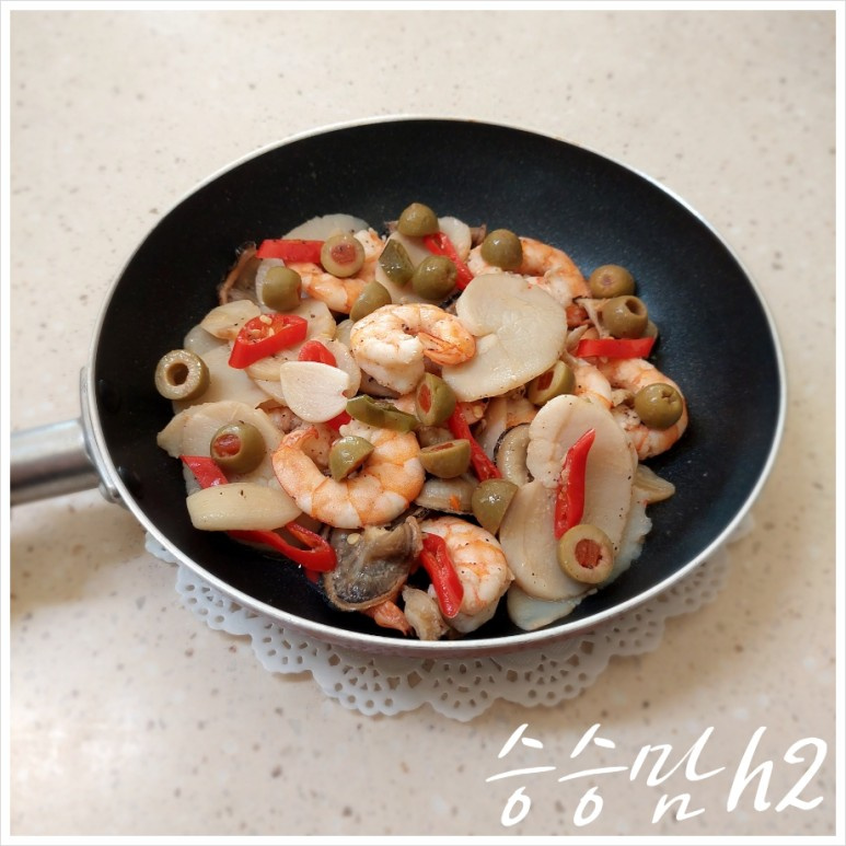 Once the shrimp and scallops are cooked through and have a nice golden color, arrange the halved green olives on top. The bright, slightly briny flavor of the olives cuts through the richness of the butter, adding a refreshing note. Serve immediately for the best taste experience!