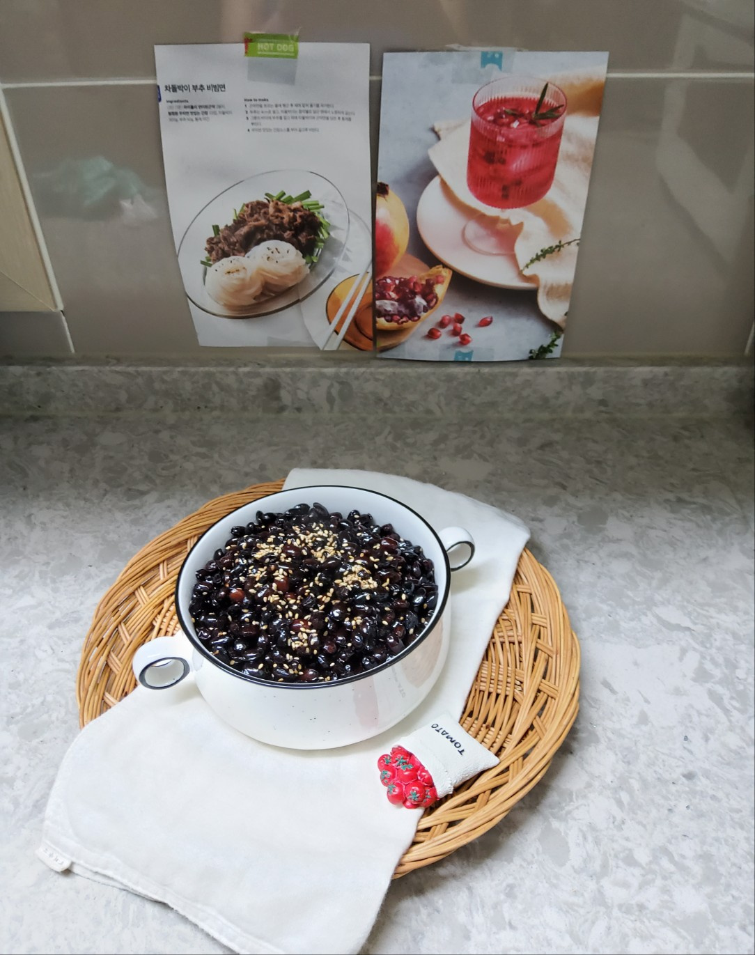 As the braised soybeans are nearing completion and have a nice sheen, stir in 1 Tbsp of sesame oil just before turning off the heat to add a fragrant aroma. A quick mix will enhance the overall flavor.