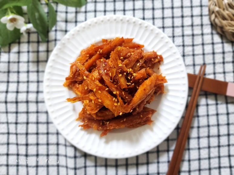 Check the thickness of the pollack strips. If they are thick, tear them into bite-sized pieces or cut them with scissors to about the length of your middle finger. This ensures the seasoning coats them evenly, making them more delicious.