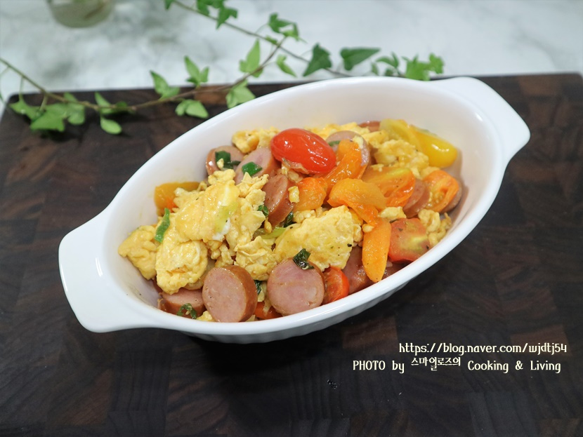 Introducing the nutritious ‘Tomato and Egg Stir-fry,’ a dish you can whip up in just 5 minutes on busy mornings! Made with essential fridge staples like eggs and sweet-and-tangy tomatoes, this simple yet satisfying meal is perfect for a fulfilling breakfast. We’ve elevated the classic ‘Todakbok’ by adding plenty of cherry tomatoes and popping sausages for a delightful twist. More than just delicious, this dish is packed with health benefits, thanks to lycopene, a powerful antioxidant found abundantly in tomatoes. Lycopene is known for its potential to help prevent strokes, heart attacks, combat aging, fight cancer, and lower blood sugar levels. Interestingly, cooking tomatoes with oil enhances the absorption of these beneficial compounds! With simple ingredients, an easy cooking process, and a fantastic combination of flavor and nutrition, start your day right with this healthy and tasty ‘Tomato Egg Stir-fry.’