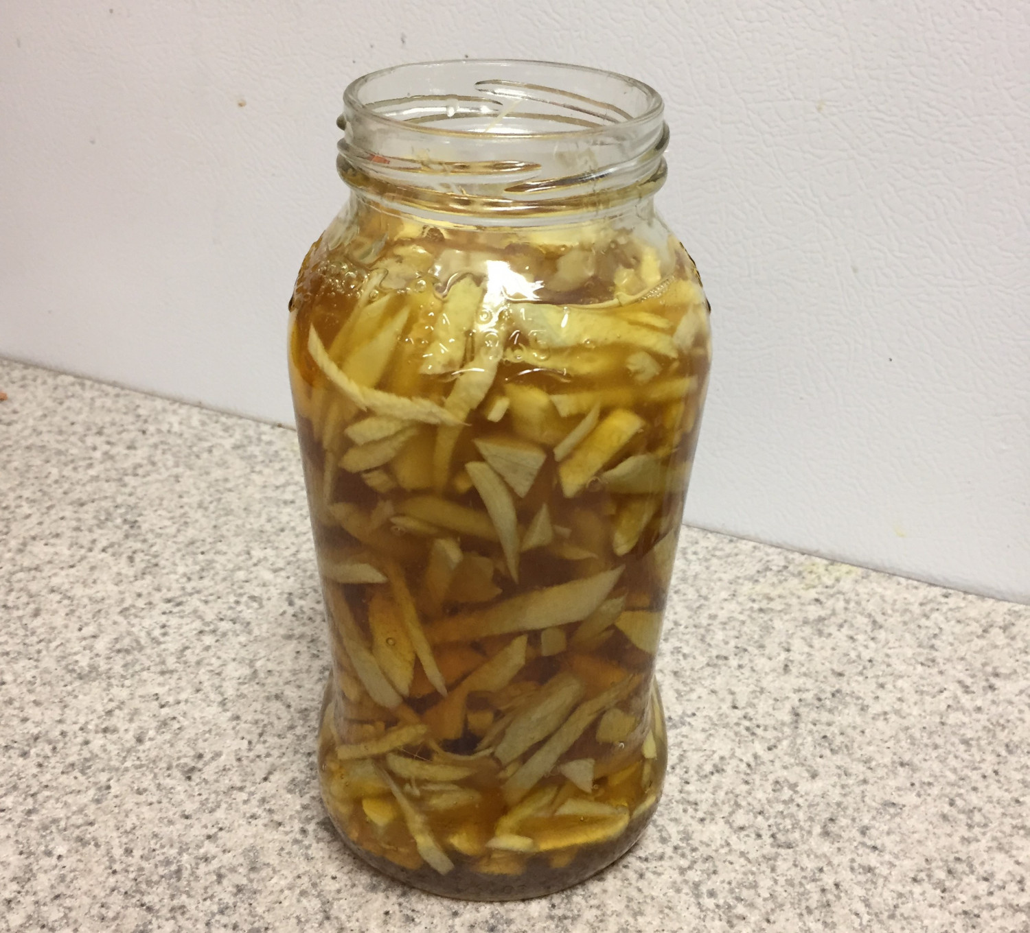 Pack the sliced ginger generously into your prepared jar. The ideal ratio of ginger to honey is 1:1 by weight. Even if the ginger seems to fill the jar, the honey will help to compress it. (In this instance, all the ginger was transferred to the larger jar on the right.)