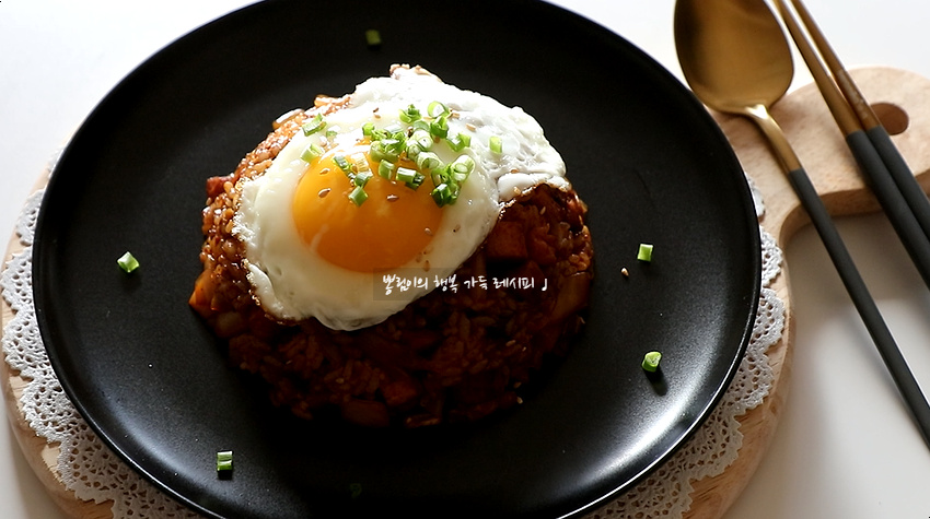 Gently place the cooked fried egg on top of the molded Spam Kimchi Fried Rice. The runny yolk will blend beautifully with the rice when you dig in!