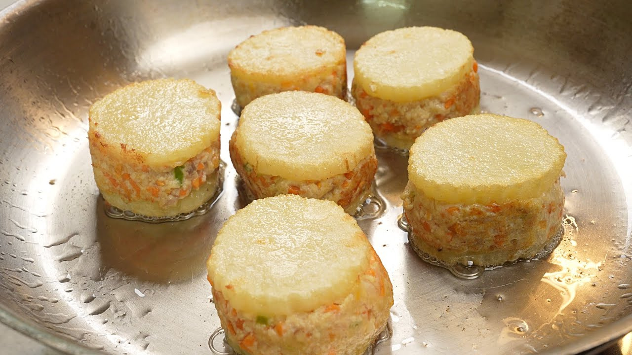 It’s time to combine the batter and potatoes and shape them. Before preheating the pan, place about 1 tablespoon of the tofu, tuna, and vegetable mixture generously onto a potato slice that has been coated with cornstarch. Then, cover it with another potato slice, sandwiching the filling between the potatoes. This method encases the filling within the potato layers, resulting in tender insides and crispy outsides.