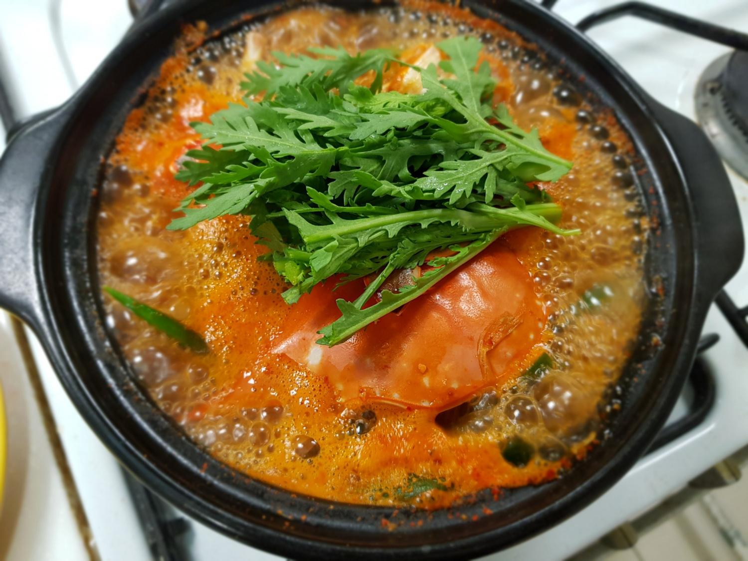Finally, add the crown daisy and cook just until wilted. Be careful not to overcook the crown daisy, as it can become mushy. Taste the stew and, if needed, add a tiny pinch of salt to adjust the seasoning to your preference. Your refreshing and spicy snow crab stew is now ready!