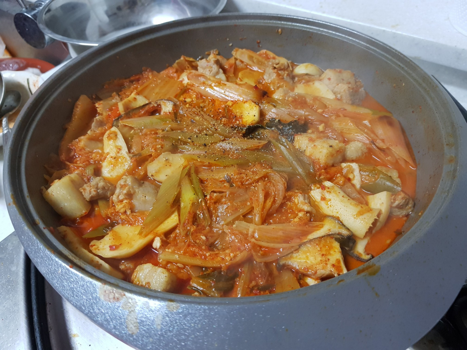 Take out the insides of the well-fermented kimchi (1 head, about 500g) and chop it into bite-sized pieces. Add the chopped kimchi to the pot with the seared pork and stir-fry together. This step enhances the kimchi’s flavor.