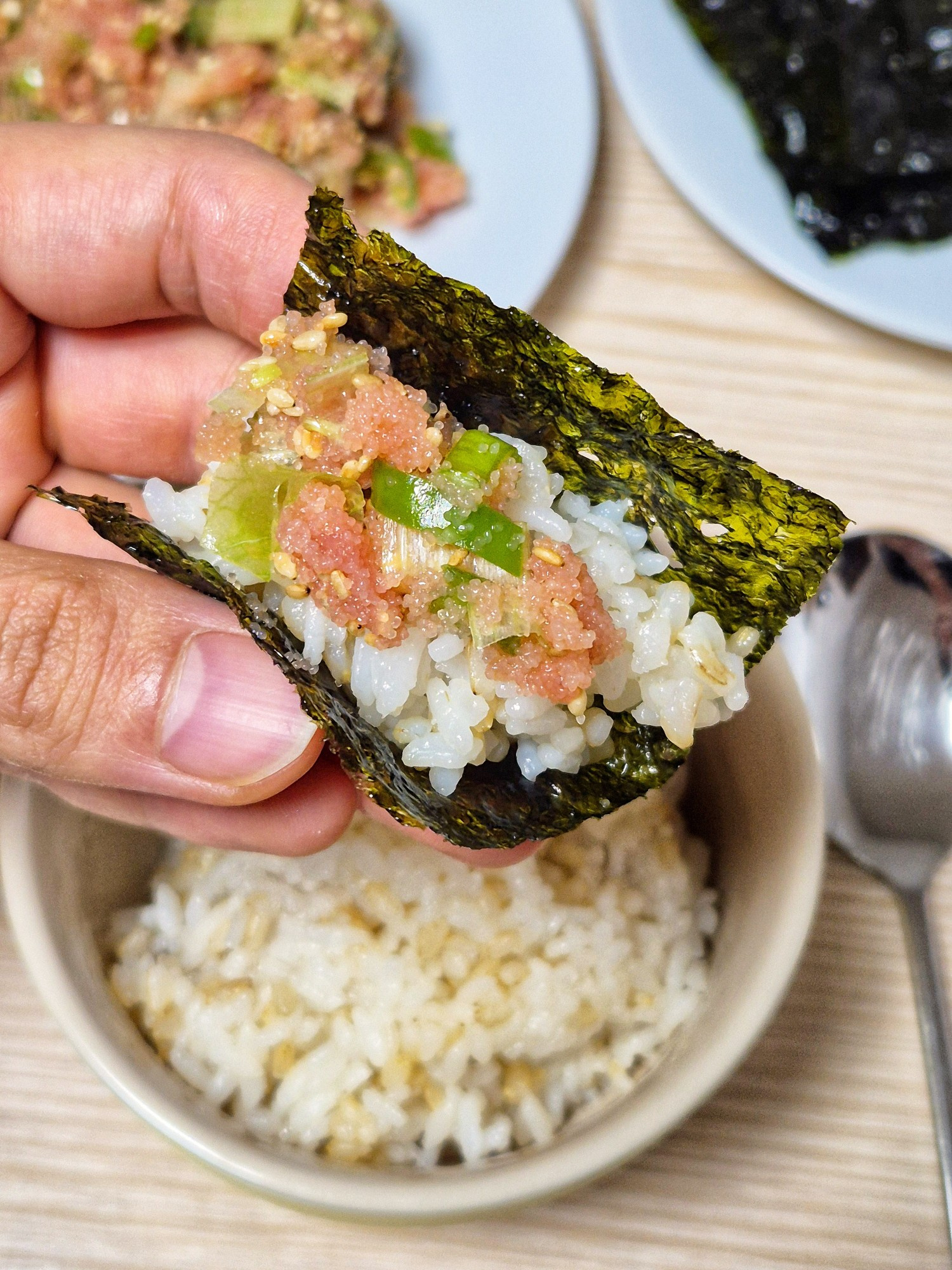 Prepare the green onion or the white part of the leek. You’ll need about 20g. Wash it thoroughly and mince it very finely. If the pieces are too large, they can affect the texture, so aim for the smallest pieces possible.