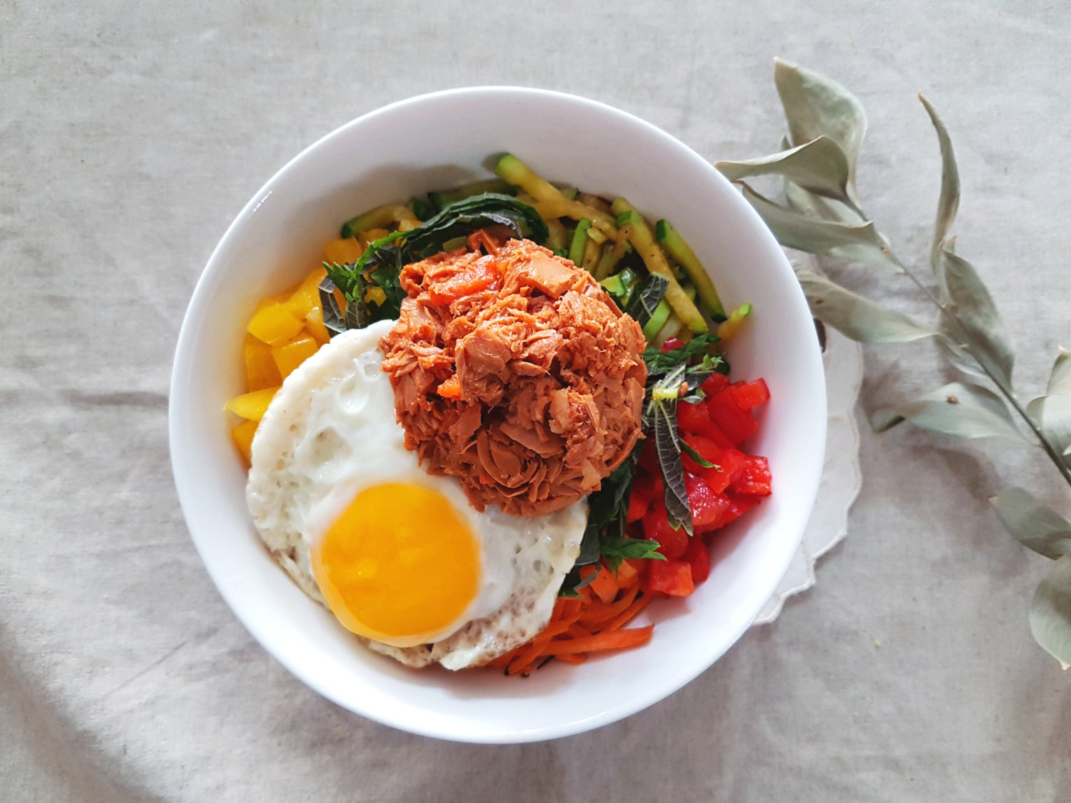 What’s better than bibimbap for using up leftover ingredients in the fridge? We’re introducing a super simple tuna bibimbap that’s great for your diet plan, made with slightly wilted vegetables and chili tuna. By using chili tuna instead of gochujang (red chili paste), we lower the calorie count while still getting over 13g of protein. Let’s make this beautiful, satisfying, and protein-packed dish that’s a triple threat – perfect for clearing out your fridge!