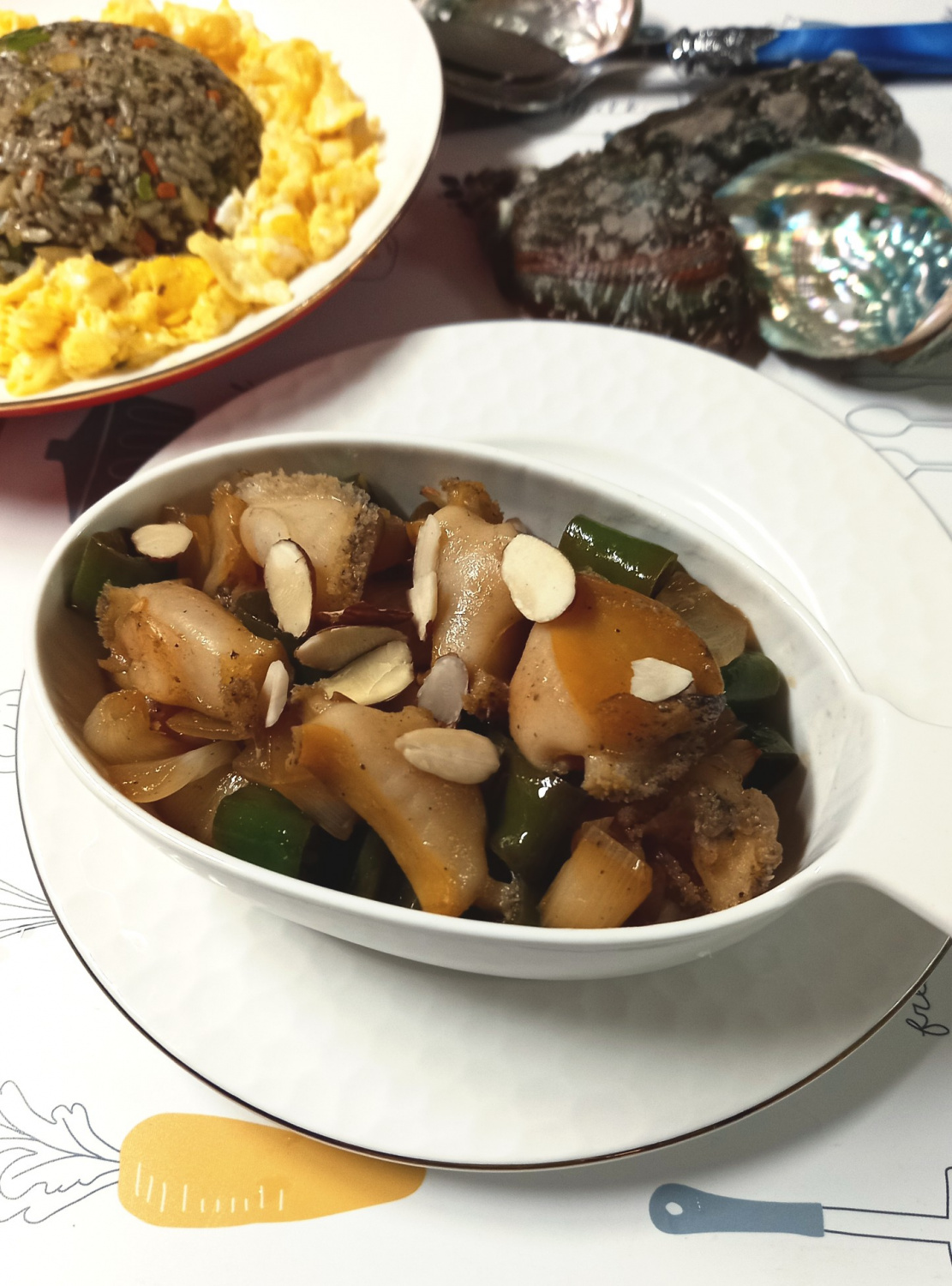 Transfer the delicious abalone stir-fry to a serving plate. Sprinkle with sliced almonds for a crunchy finish and a beautiful presentation. Enjoy your meal!