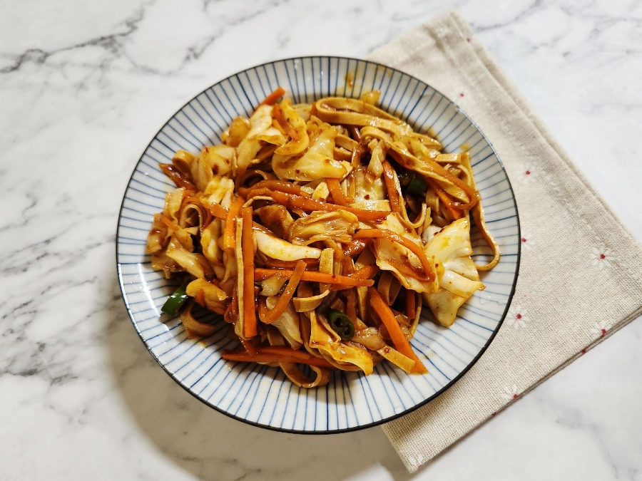 Rinse the dried tofu noodles (Gundubu) under running water and then drain them thoroughly in a colander. Excess water can cause the noodles to clump together when stir-frying.