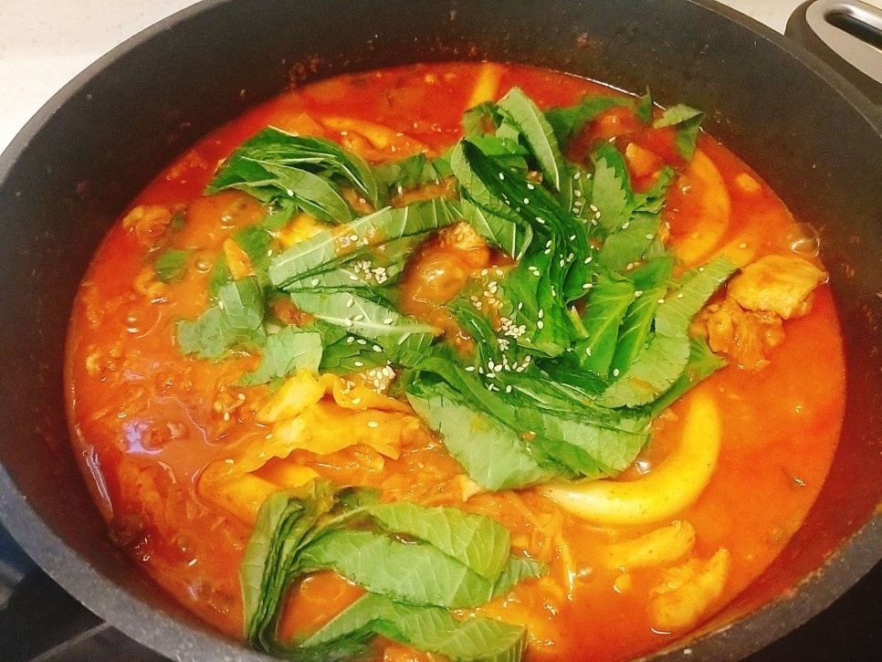 Simmer for another 10 to 15 minutes, or until the chicken is cooked through and the sauce has thickened slightly. Once everything is perfectly cooked, turn off the heat. Garnish generously with the roughly chopped perilla leaves and a sprinkle of sesame seeds. Your delicious Chuncheon-style Dakgalbi is now ready to be enjoyed! It’s wonderful served with rice or as a wrap. If desired, you can add udon, glass noodles, or jjolmyeon noodles during the last few minutes of cooking for an even more satisfying meal.