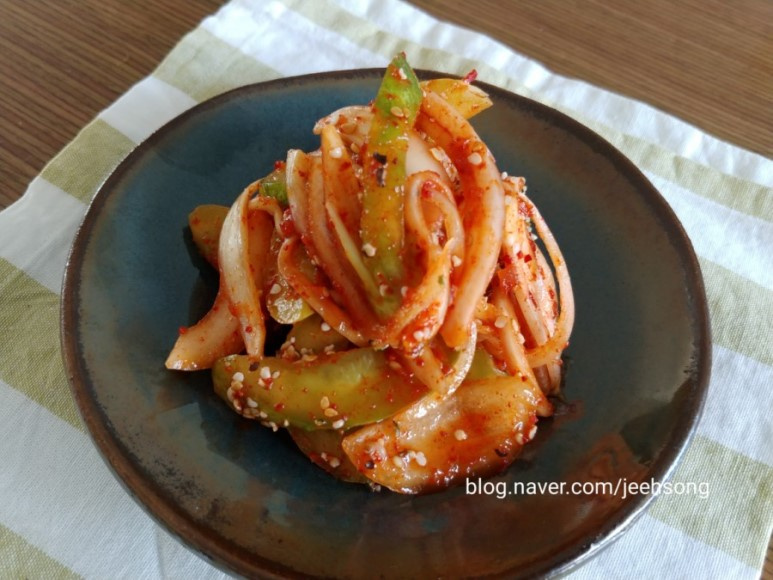In a large mixing bowl, combine the prepared cucumbers and the sliced onions. Add the seasoning ingredients: 1 tablespoon of red pepper flakes, 1/2 tablespoon of minced garlic, 1 tablespoon of grated ginger (you can reduce or omit this if you prefer a milder ginger flavor), 1 tablespoon of salted shrimp juice (fish sauce or soy sauce can be used as substitutes), and 2 tablespoons of plum extract for a touch of sweetness. Gently mix everything together to ensure the seasoning is evenly distributed. Be careful not to overmix, as this can make the cucumbers mushy.