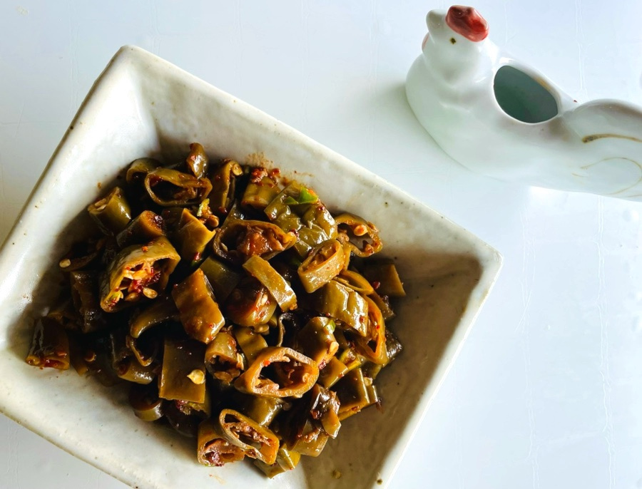 Once drained, cut the pickled chilies into bite-sized pieces. Avoid cutting them too small, as this can diminish the satisfying chewiness.