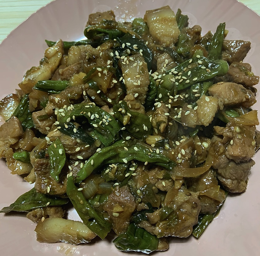 When the pork is mostly cooked and has changed color, add the lightly salted Korean green peppers and stir-fry together. It’s best to stir-fry green peppers over high heat quickly to maintain their crispiness.