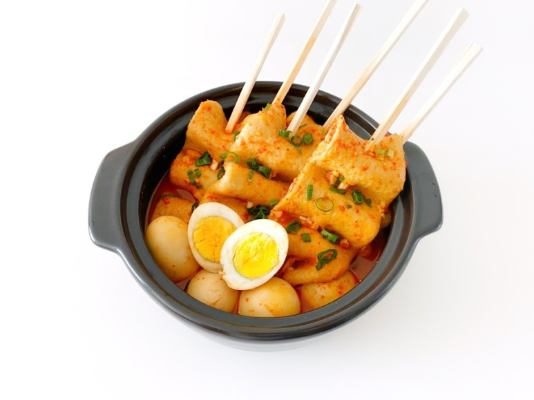 Now, add the skewered fish cakes and the pre-boiled eggs to the broth. Begin to simmer over medium heat, allowing the fish cakes to absorb the flavors. Starting on high heat and then reducing to medium after adding the ingredients helps prevent the sauce from burning while ensuring it simmers gently.