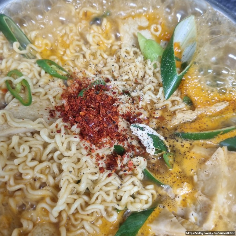 After adding the soup, when the broth boils, add the blanched ramen noodles, the sliced fish cakes, green onions, and Cheongyang peppers all at once. The savory flavor from the fish cakes and the fresh aroma of the vegetables will infuse the broth.