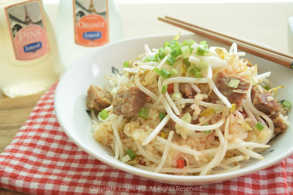 No need for side dishes! This Tteokgalbi fried rice features a delightful crunchy texture from bean sprouts.