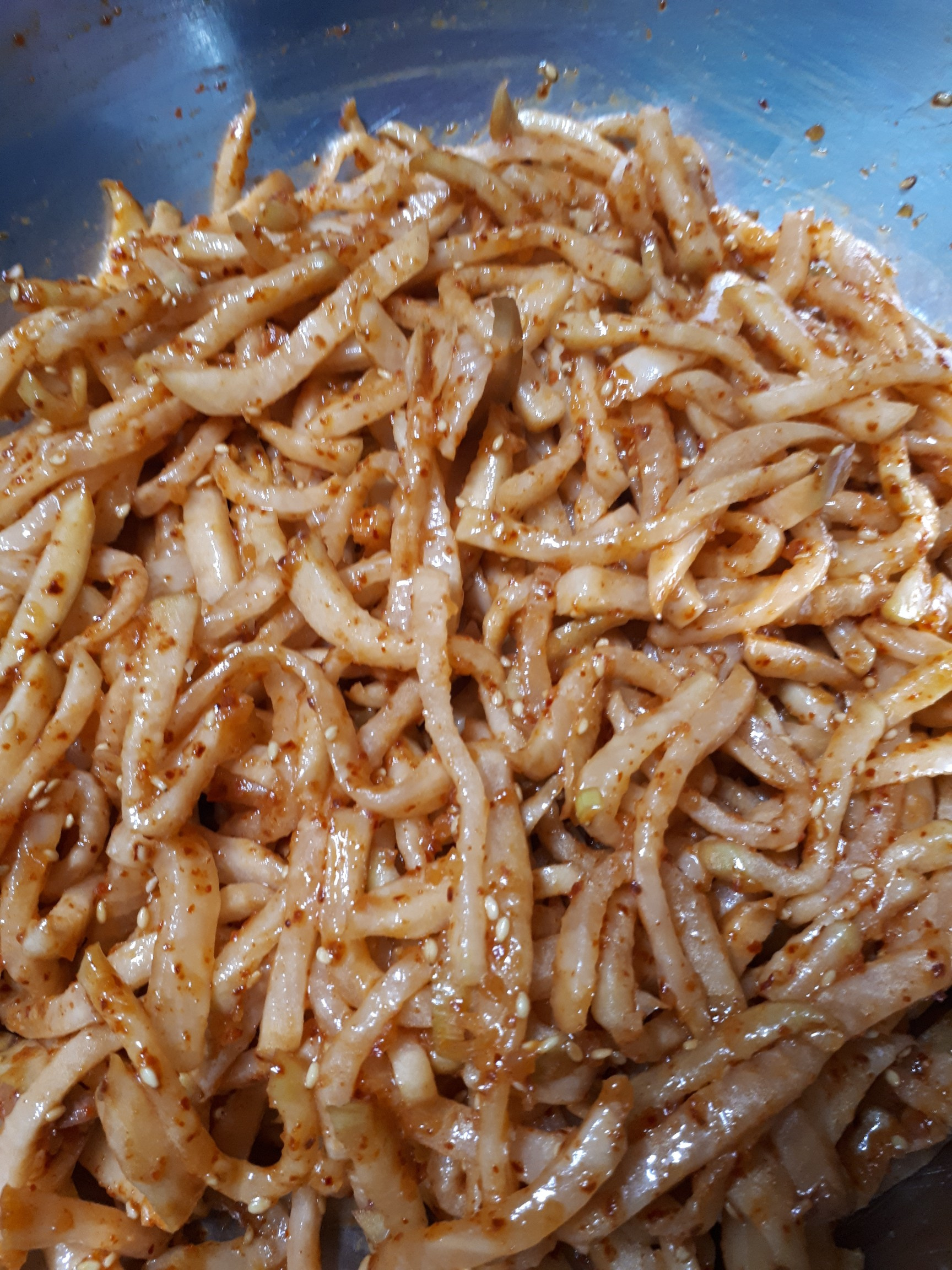 I’ve turned some leftover dongchimi radish from last winter into a simple, spicy radish salad, similar to ‘mu-saengchae’! It’s a delicious and simple alternative to expensive cabbage kimchi. Enjoy its delightful crispness and tangy flavor.
