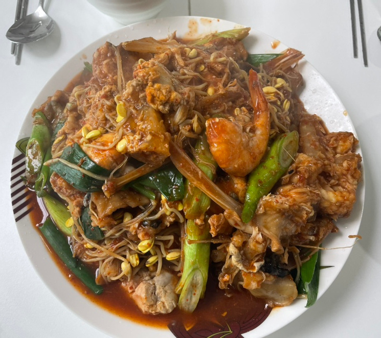 Now it’s time to combine everything! In a pan, add the parboiled monkfish, the cleaned sea squirts, and the prepared sauce. Toss them together to coat evenly. Top with a generous amount of fresh bean sprouts, cover the pan, and simmer over medium heat. Cook until the bean sprouts wilt and the flavors meld together.