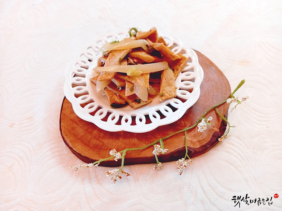 First, heat a pan over medium-low heat and add a little oil. Add the chopped green onions and stir-fry them to release their fragrant oil. Once the aroma is strong, add the fish cakes cut into bite-sized pieces (about 2-3cm wide) and the thinly sliced onion. Stir-fry them together. It’s important to stir-fry the fish cakes until they become soft and tender.