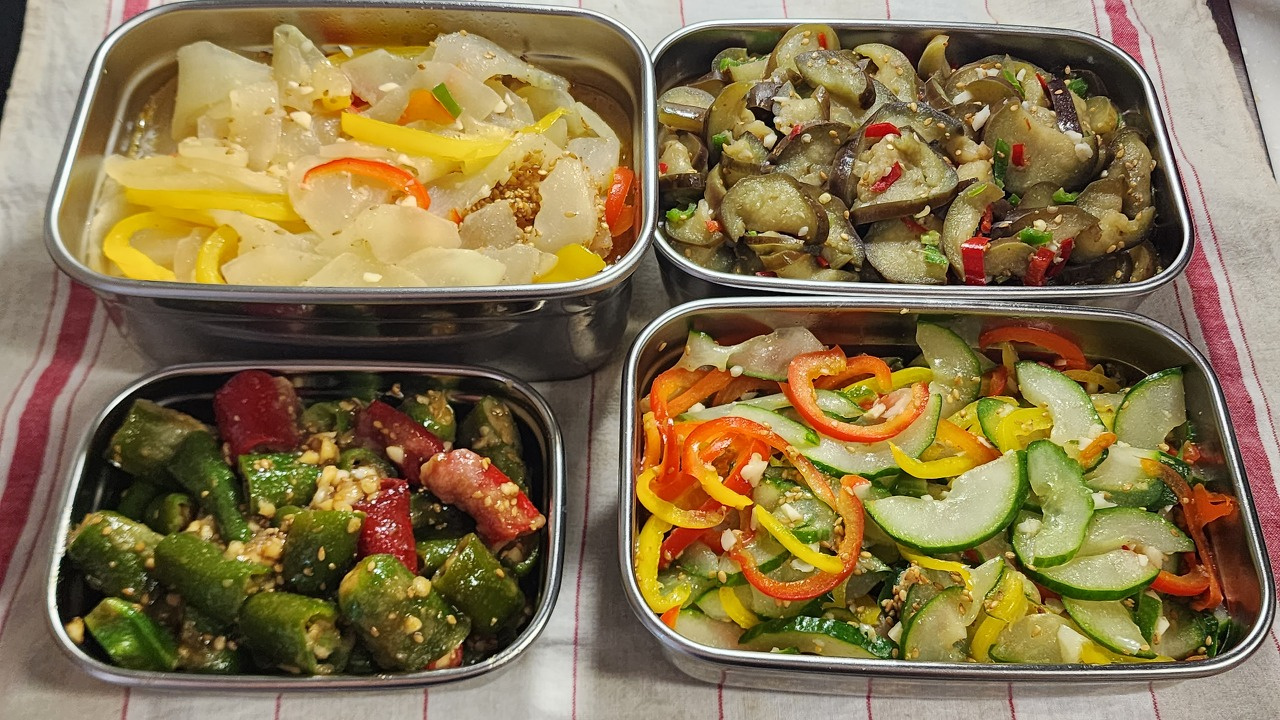 Here are four types of side dishes (steamed peppers, stir-fried cucumbers, stir-fried eggplants, and stir-fried cucumbers) made with fresh vegetables from my brother-in-law’s garden. We’ve brought out the natural flavors of these seasonal vegetables, making them perfect companions for rice. A healthy choice for your family – try them now!