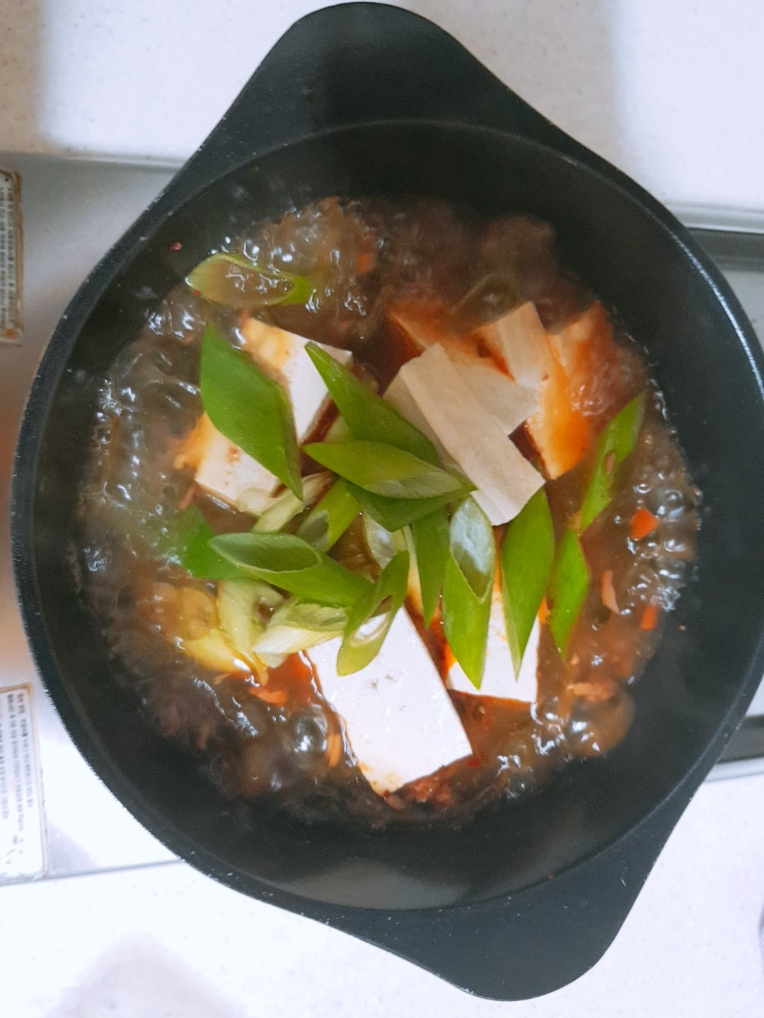 Cut 1 block of tofu into bite-sized pieces and add it to the pot. Also, add the thinly sliced green onion. Tofu adds a soft texture to the stew, while green onions contribute a refreshing aroma, making it even more enjoyable.