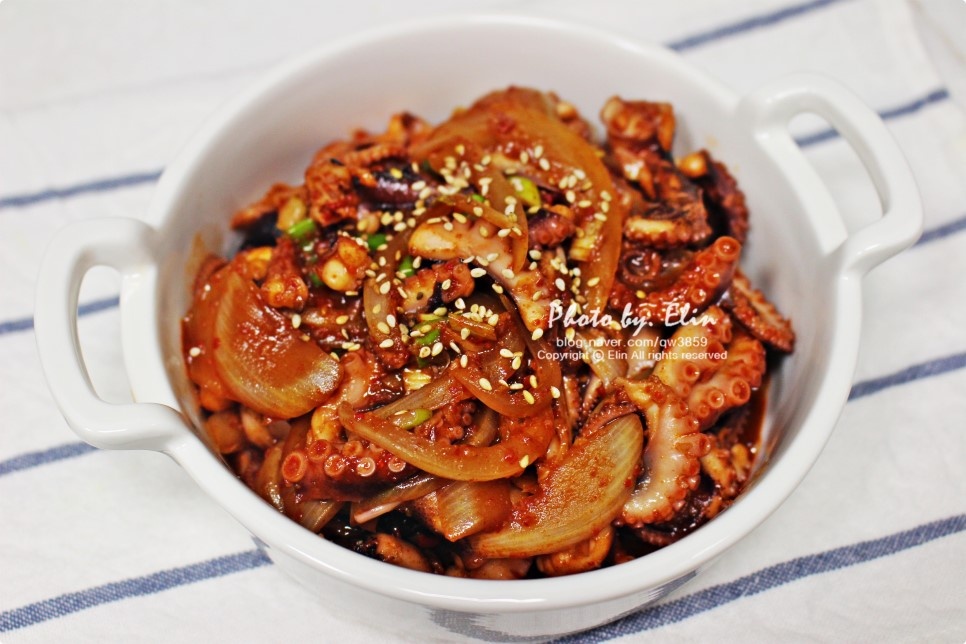 This spicy stir-fried baby octopus is incredibly flavorful and satisfying. Don’t forget to mix the leftover sauce with rice – it’s a game-changer! Visit http://blog.naver.com/qw3859 for more culinary inspiration.