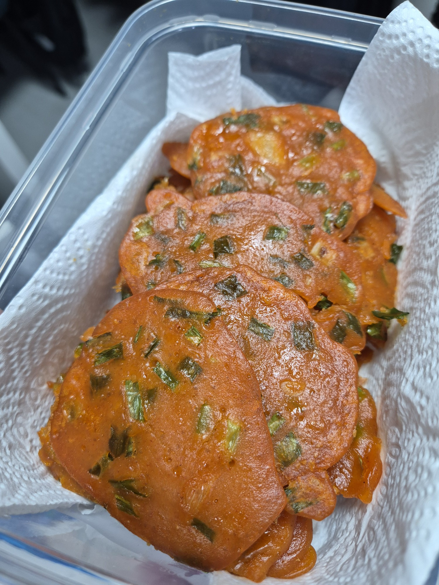 Your crispy, golden-brown Gochujang Tteok pancakes are ready! Enjoy them immediately while they are warm for the best flavor experience. The spicy and sweet combination will surely whet your appetite.