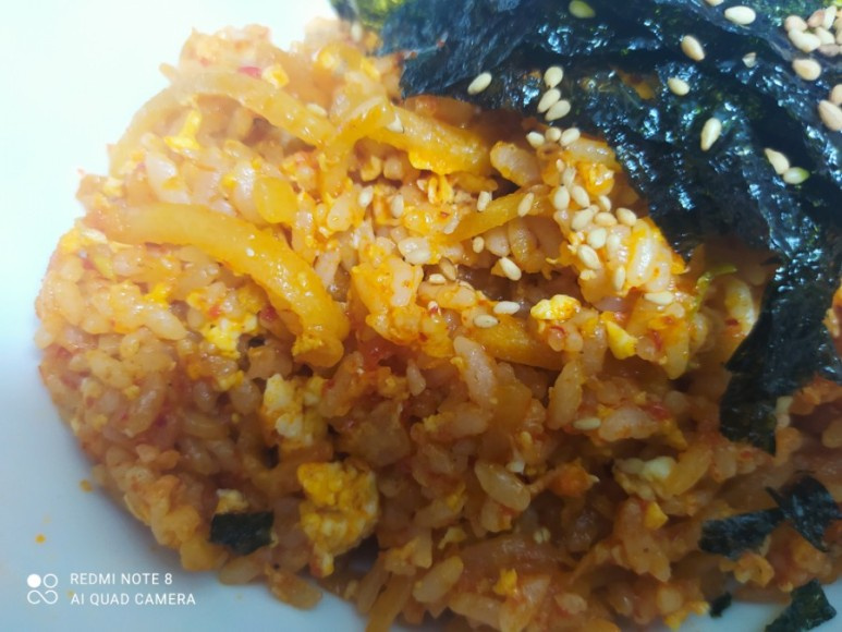 Transfer the finished radish kimchi fried rice to a nice serving bowl. Sprinkle generously with shredded seaweed (gim-garu) and a final pinch of toasted sesame seeds for a delicious and attractive presentation!