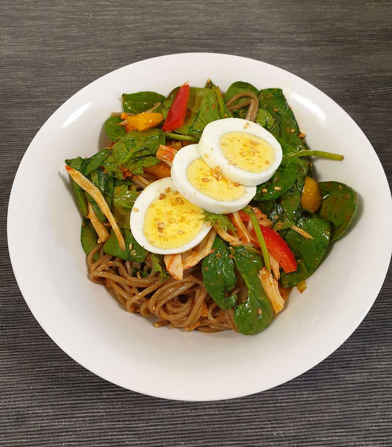 In a large mixing bowl, combine the drained buckwheat noodles, prepared salad greens, and shredded crab sticks. Add the dressing gradually, in 2-3 additions, rather than all at once. Gently toss everything together, being careful not to mash the noodles or vegetables. It’s important to taste as you go and adjust the seasoning to your preference. For an even more satisfying meal, you can add a hard-boiled egg on the side!