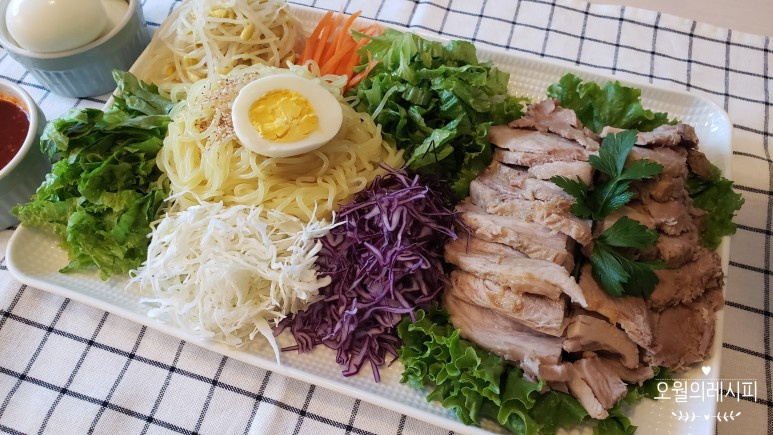 All the preparations are complete! Arrange the Jjolmyeon noodles attractively on a large plate or bowl. Artfully arrange the julienned onion, carrot, red cabbage, regular cabbage, and the prepared bean sprouts on top, creating a colorful presentation. Finally, place the thinly sliced Bo Ssam pork alongside. Your delicious ‘Spicy & Tangy Jjolmyeon with Lemon Pork Bo Ssam’ is ready to be enjoyed! Serve with your favorite Jjolmyeon sauce (store-bought or homemade).
