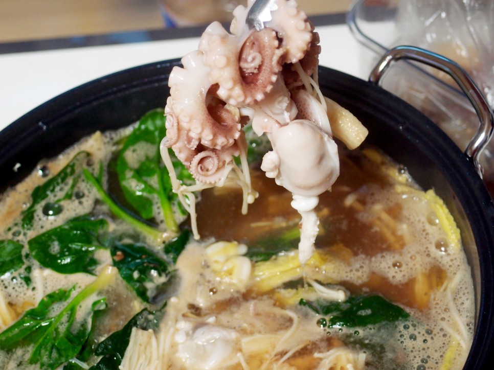 Enjoy the plump, perfectly cooked baby octopus by dipping it into your chosen sauce for an incredible culinary experience. Along with the chewy octopus, don’t forget to enjoy the tender spinach, crisp napa cabbage, and slippery enoki mushrooms. For the dipping sauce, you can mix soy sauce with a little pollack broth and wasabi, or opt for a sweet and tangy gochujang-based sauce according to your preference.