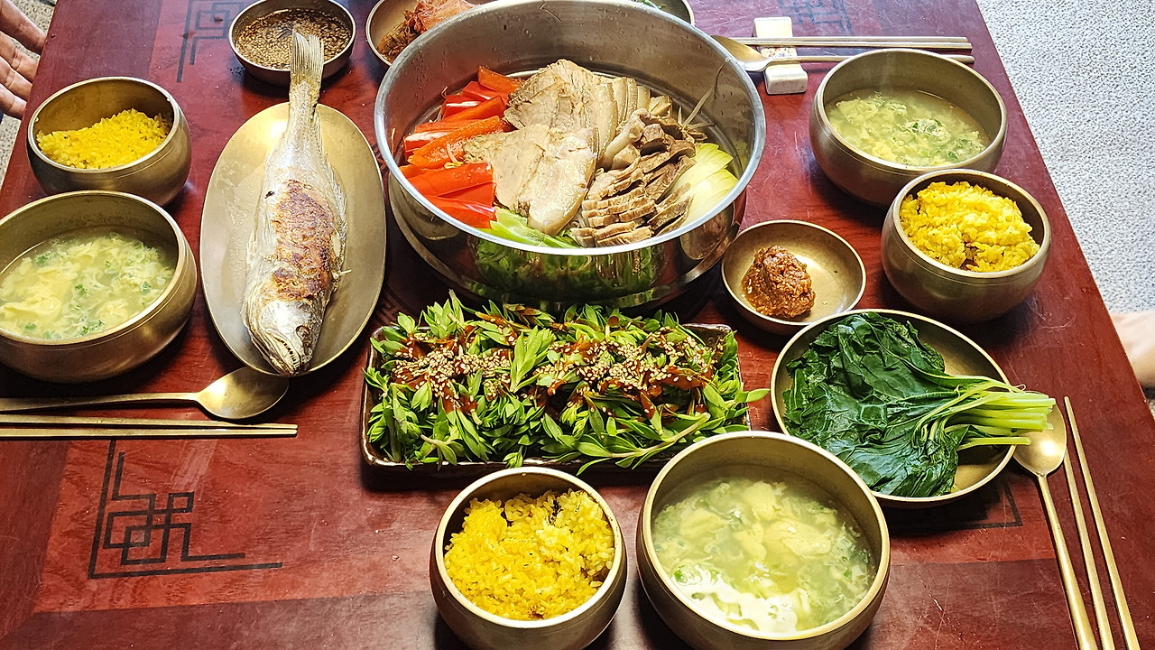 Arrange the sliced bell pepper, onion, and green onion attractively over the bean sprouts. Next, carefully place the sliced boiled pork belly on top of the vegetables. Layering the ingredients like this will make the dish visually appealing.