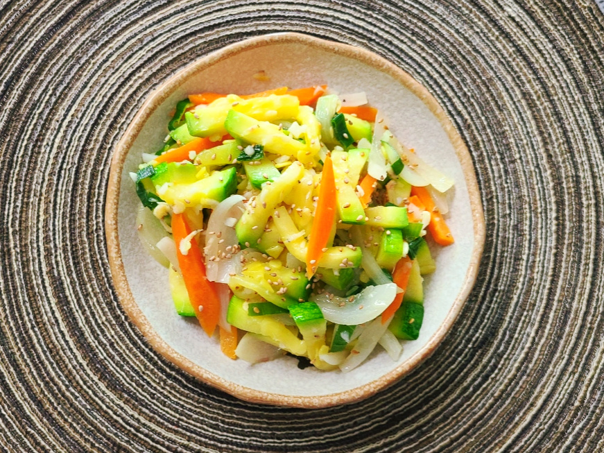 Continue stir-frying until the zucchini becomes slightly translucent and the volume reduces, but still retains a slight crispness (‘salkang’). Avoid overcooking, as the zucchini can become mushy.