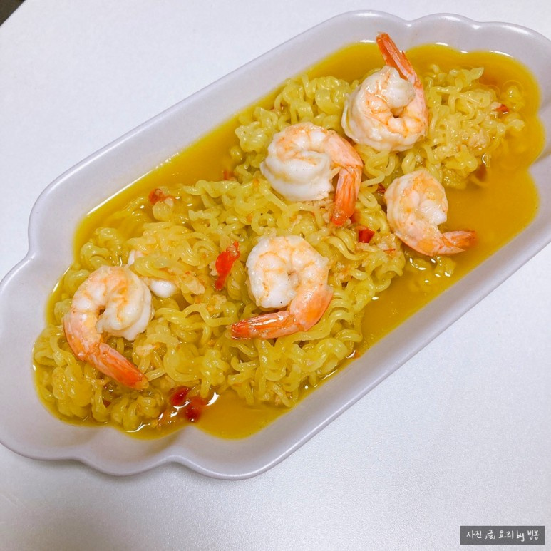 Carefully transfer the cooked noodles and shrimp into a serving dish. Sprinkle in 1/3 of the ramen soup base to season. This unique step replaces the need for salt, providing a savory depth that perfectly balances the dish. It’s the clever secret to this quick recipe!