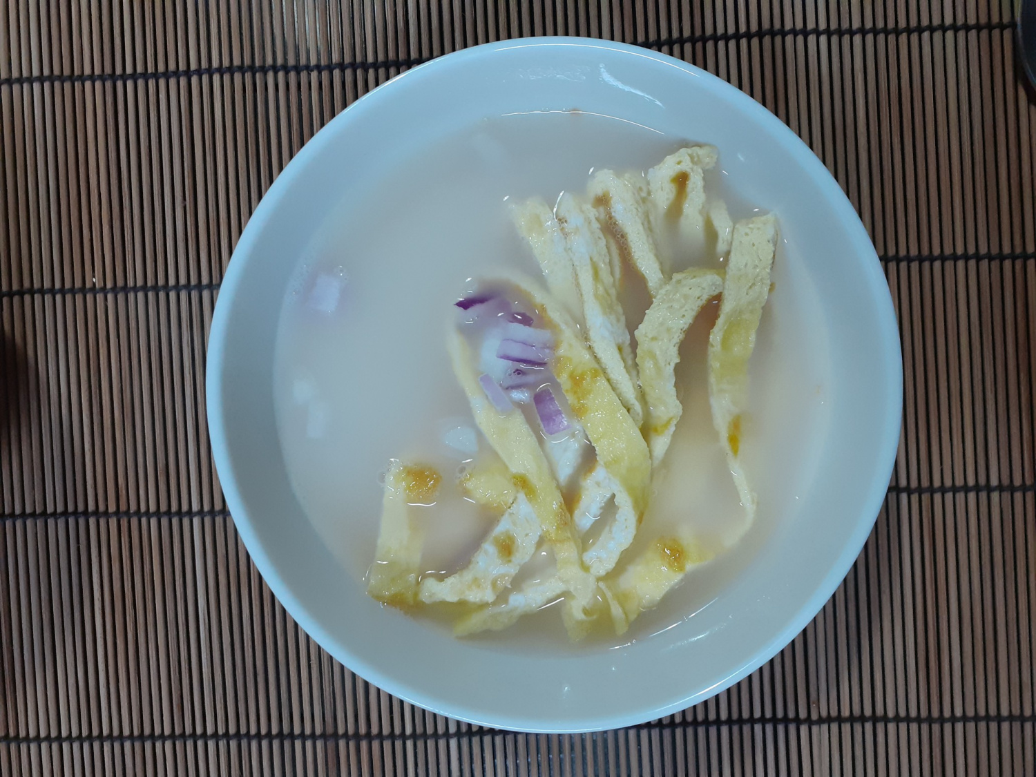 Once the beef bone broth is simmering, add the sliced egg ribbons to the pot. Stir in the minced onion. Let the flavors meld together for a rich and satisfying bowl. Season with salt and pepper to taste, if desired.