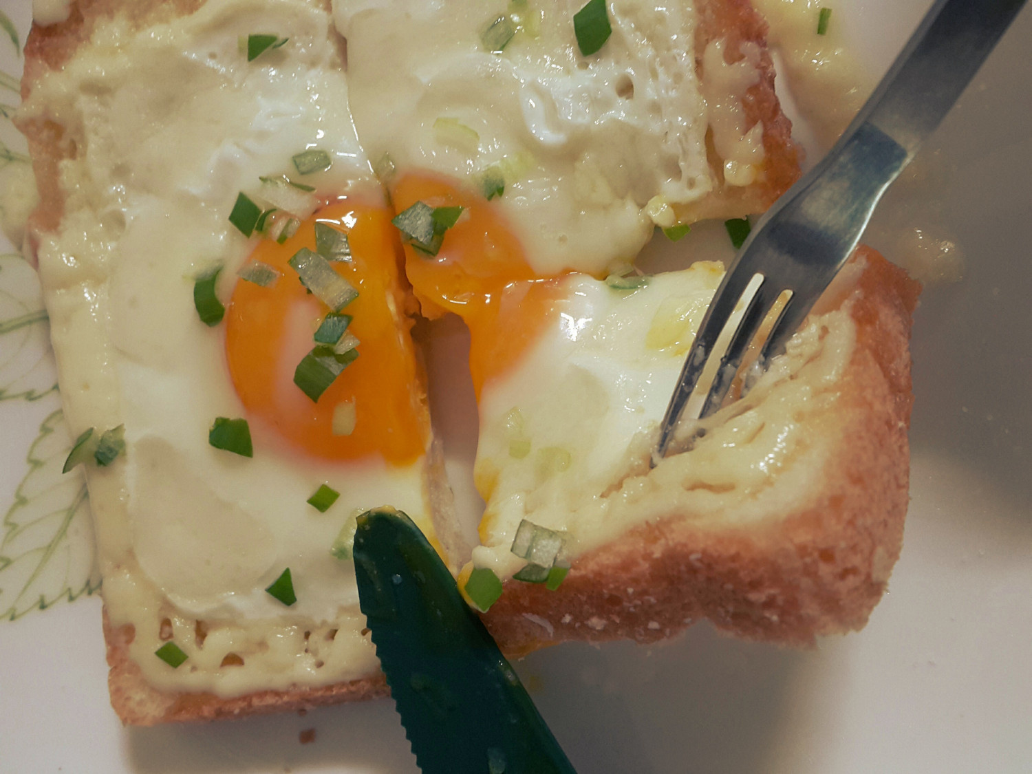 Gently press down the center of the bread to create a dam so the egg doesn’t run out. Spreading a thin line of mayonnaise around the edges will help the egg sit nicely.