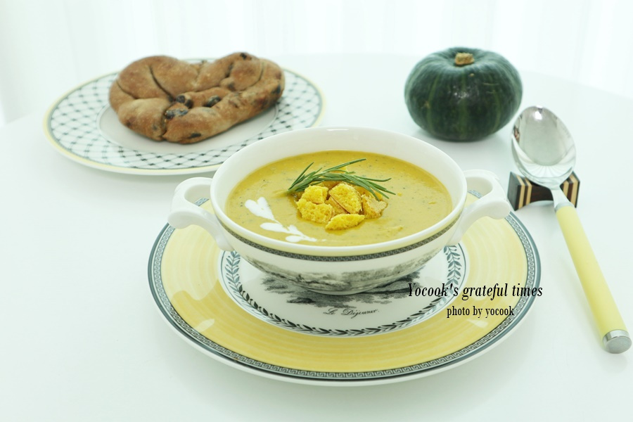 Making a wonderfully smooth, moist, and sweet Kabocha squash soup today! This soup is comforting for your stomach, making it a great simple breakfast option. It’s also delicious for dipping bread into. Since steaming Kabocha in the microwave is so easy and quick, I could whip this up in no time. Enjoy this hassle-free, delightful soup!