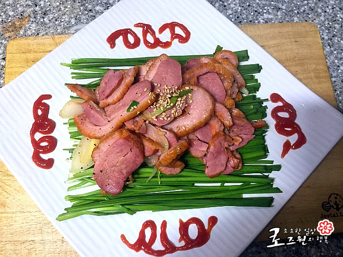 Once the onions have softened, add the 600g of smoked duck to the pan. Since smoked duck is already cooked, you can add a little oil or omit it, and stir-fry it with the onions. The duck’s own fat is often enough to cook it deliciously.