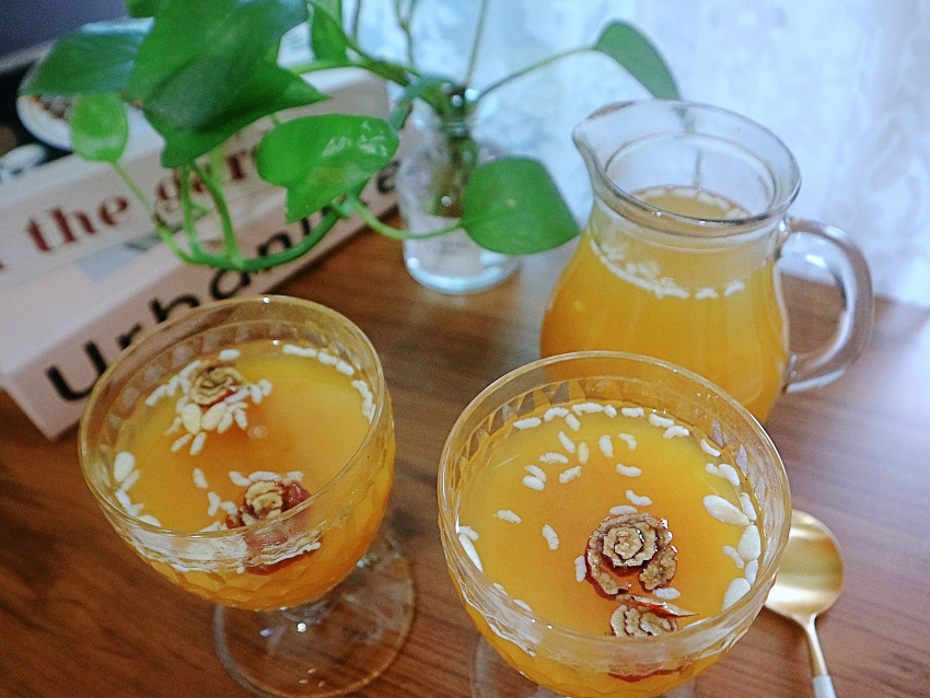 Sikhye made with sweet pumpkin boasts a beautiful, vibrant color. The sweet aroma and gorgeous hue during the preparation process add to the enjoyment.