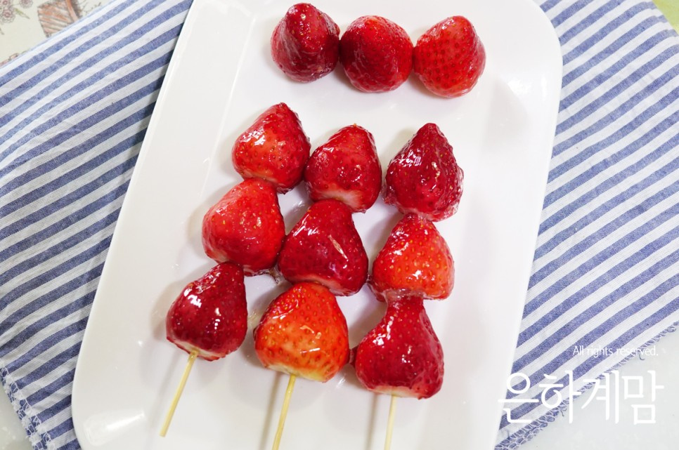 Introducing a special homemade treat made with fragrant spring strawberries: the Strawberry Tanghulu recipe! You can also try variations with blueberries in the summer or tangerines in the fall/winter. You can achieve a perfect syrup consistency without corn syrup, using only sugar and water. With the right ratio, heat control, and timing, anyone can create crispy and sweet tanghulu. Shall we start making delicious strawberry tanghulu together with Eunhagye Mom?